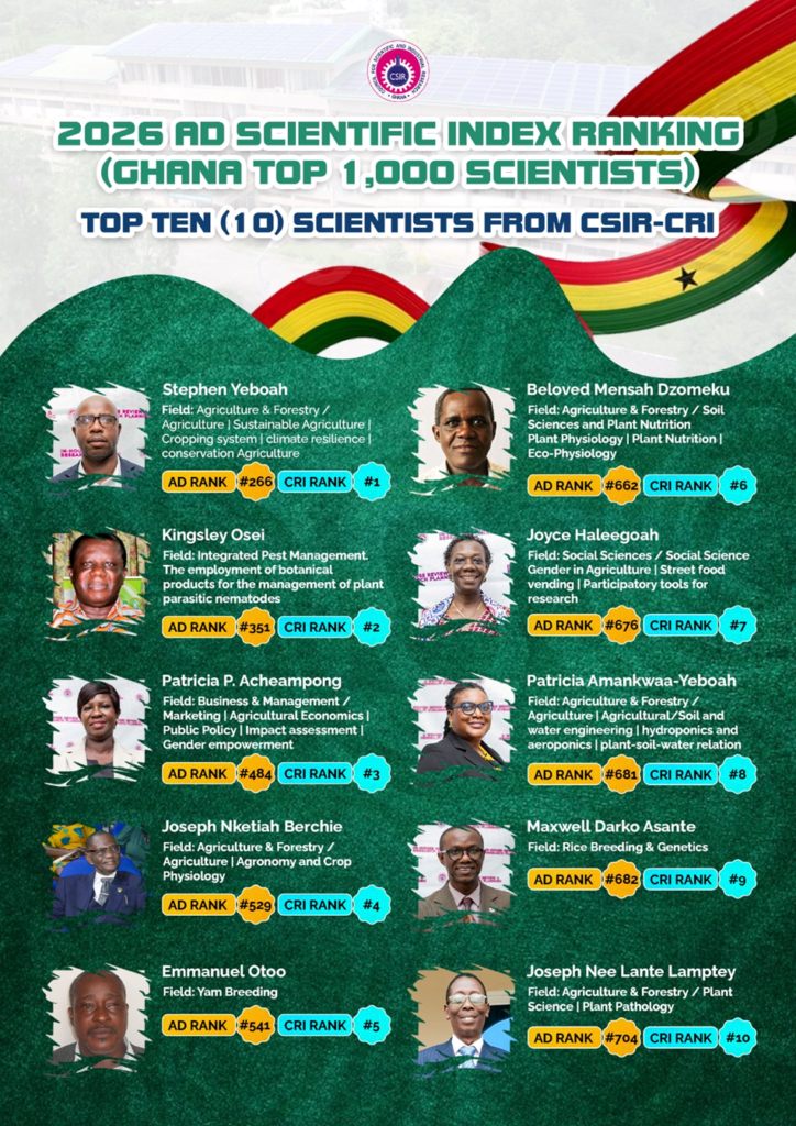 The CSIR – Crops Research Institute (CSIR-CRI) has once again affirmed its place as a powerhouse of agricultural research and innovation, following the release of the AD Scientific Index 2026 rankings. The latest global assessment highlights the remarkable contributions of Ghanaian scientists, with several researchers from CSIR-CRI earning prestigious positions among the country’s top-ranked scientists.